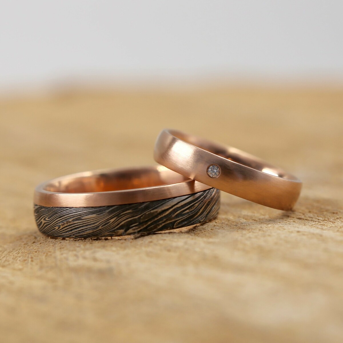 Ručně zhotovený prsten z červeného zlata ryzosti 0,585 (14 karátů), do kterého je vsazena kovaná obroučka z oceli damasteel.