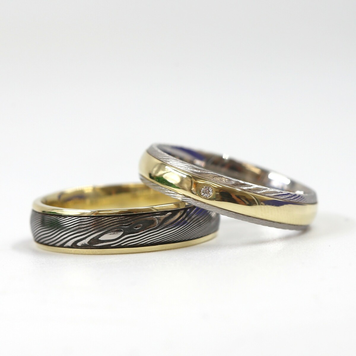 Drahé kovy snadno kombinujeme i s nerezovou ocelí damasteel nebo titanem. Prsten díky spojení více druhů materiálů a jejich vlastností získá punc neodolatelné jedinečnosti. Ze spojení drahých kovů vzniká jedinečné MOKUME GANE, které se pyšní jedinečnou strukturou prolnutých kovů.
