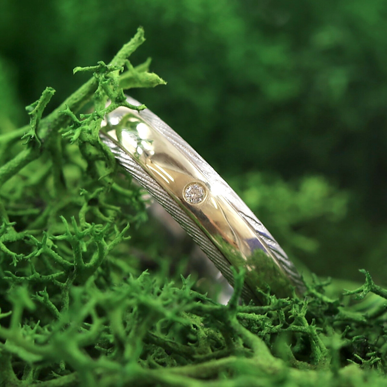 Ručně vykovaný prsten z nerezové oceli damasteel, doplněný zlatým kroužkem a osazený diamantem. Nabízíme ho jako snubní prsten, ale stejně krásně vynikne i jako zásnubní prstýnek nebo dárek z lásky ♡.