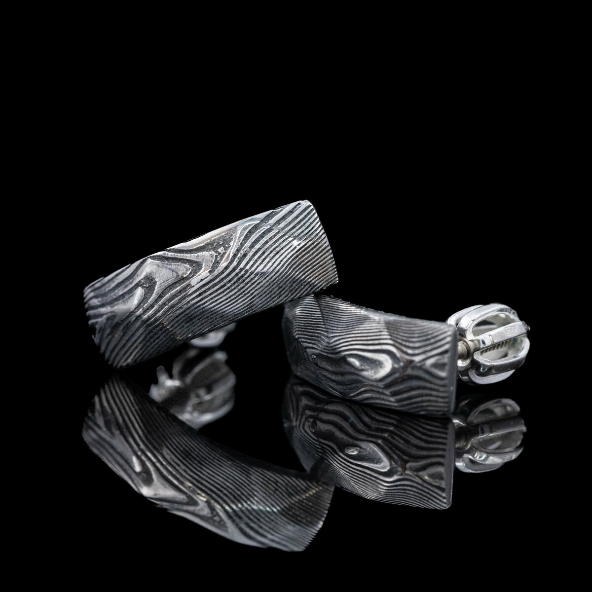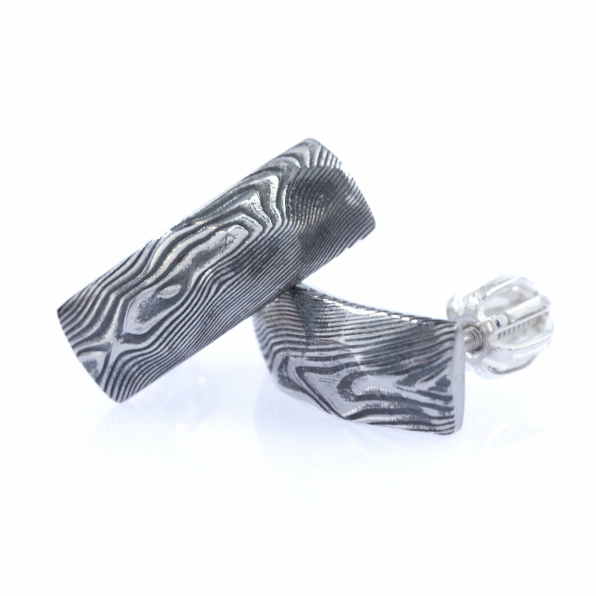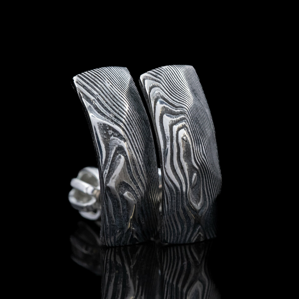 Náušnice ručně vykované z damaškové oceli, která vyniká svou krásnou kresbou připomínající dřevo.