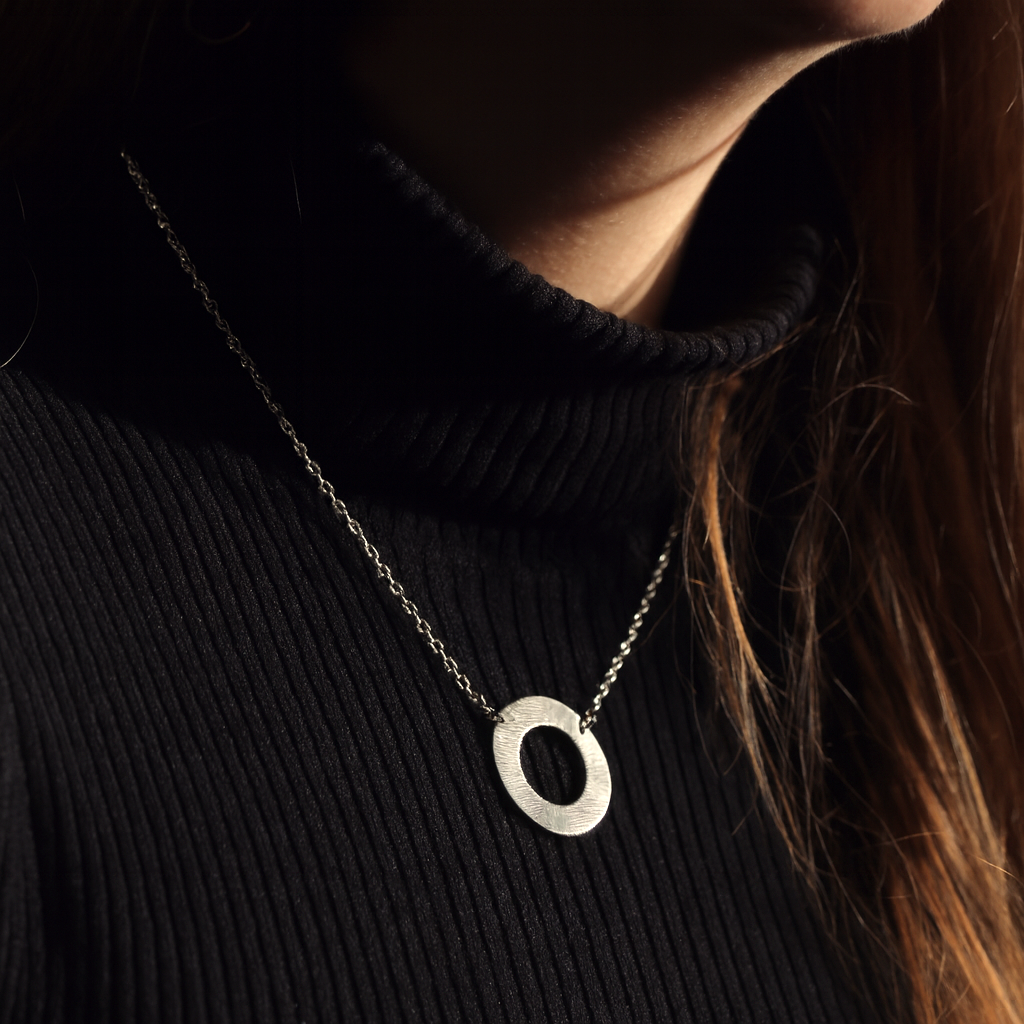 Přívěsek je zavěšen na jemném stříbrném řetízku o celkové délce 44 cm, který dokonale podtrhuje jeho minimalistický design.
