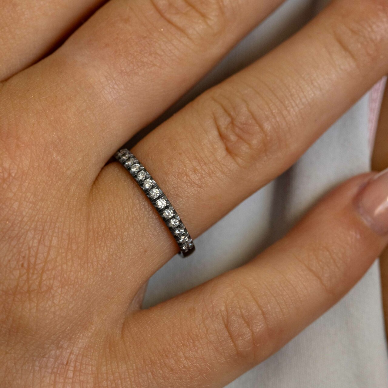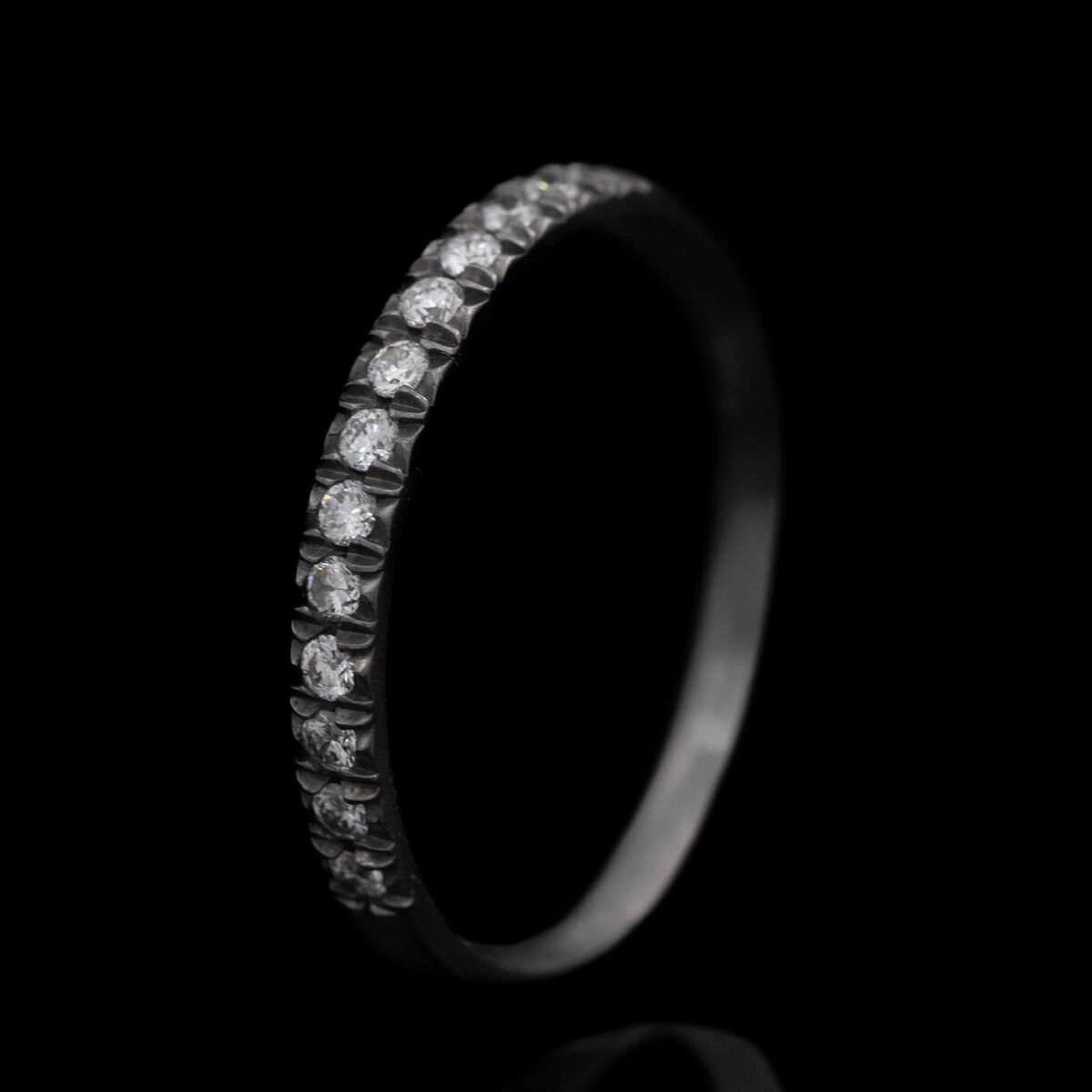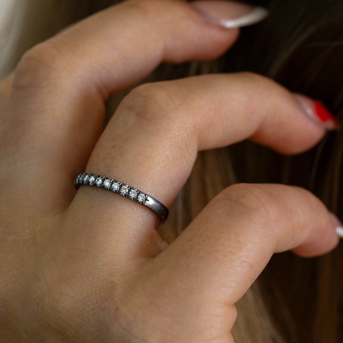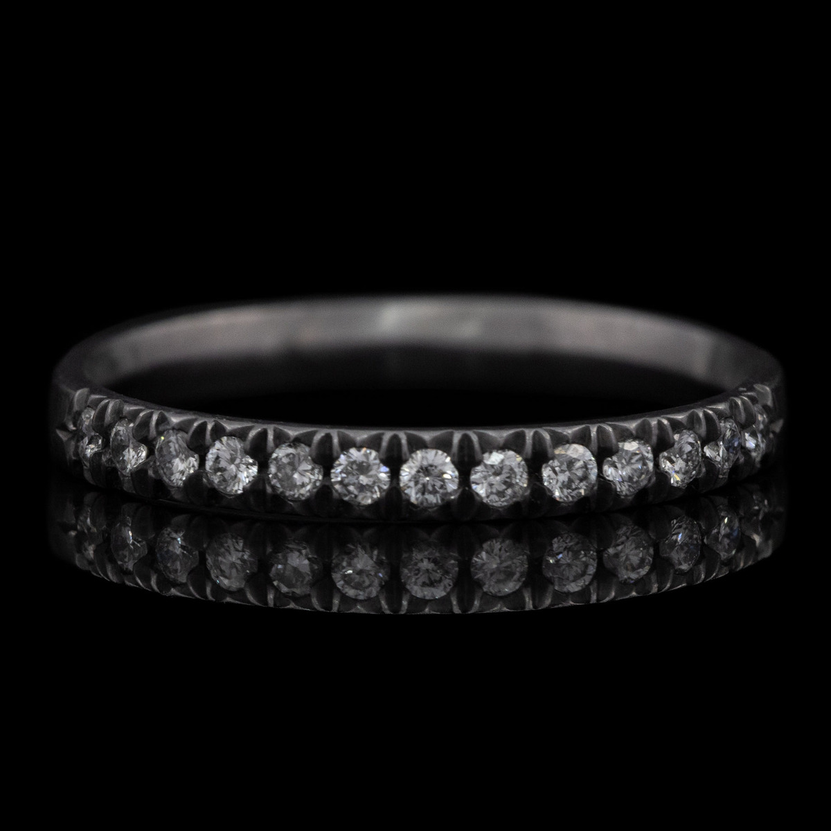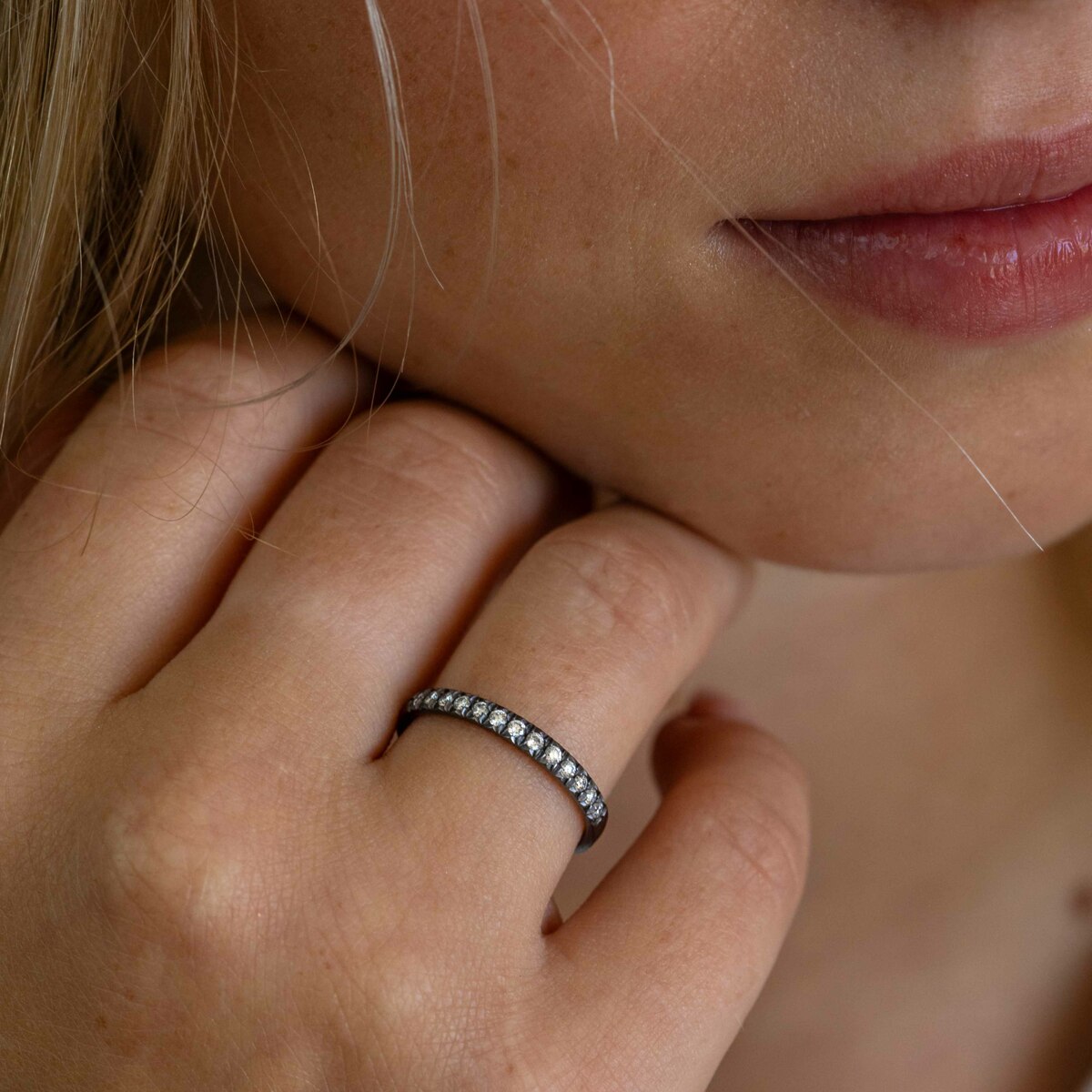 Tento výjimečný prsten je ručně vyráběný z antialergenního tantalu. Kontrast mezi tímto netradičním tmavě šedým kovem a zářivými diamanty podtrhuje elegantní a výrazný vzhled prstenu. Je ideální volbou jako snubní nebo zásnubní prsten, ale také jako výjimečný šperk pro každodenní nošení.